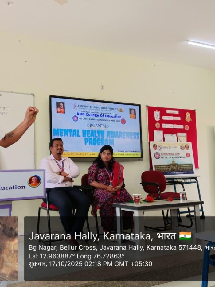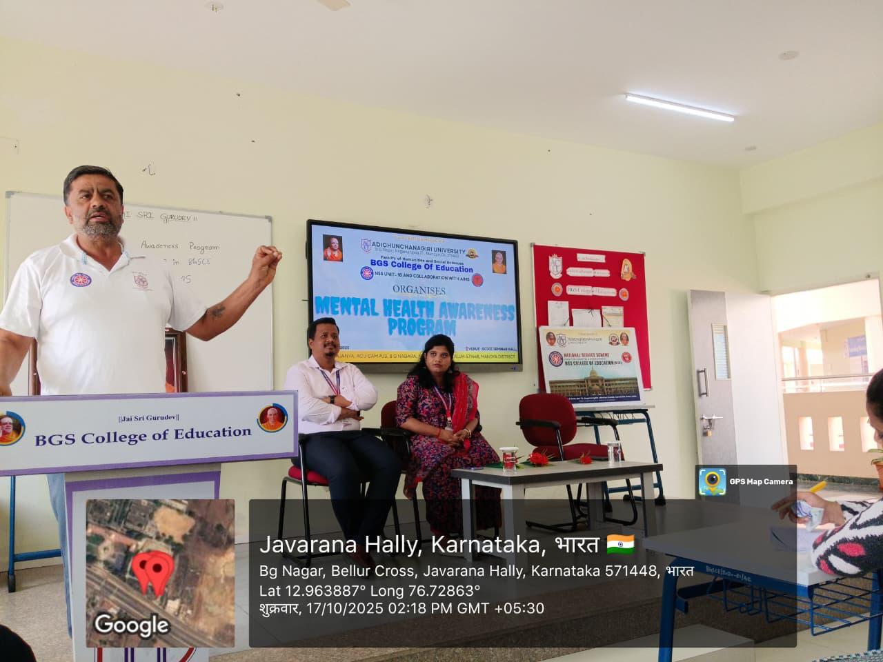 Faculty of Humanities and Social Sciences, BGS College of Education, NSS Unit – 10 in collaboration with Adichunchanagiri Institute of Medical Sciences was successfully organised Mental Health Awareness Program for 1st year B.Ed teacher trainees on the occasion of World Mental Health Day October-2025, at Seminar Hall, BGSCE Panchajanya Building on 17th October 2025.