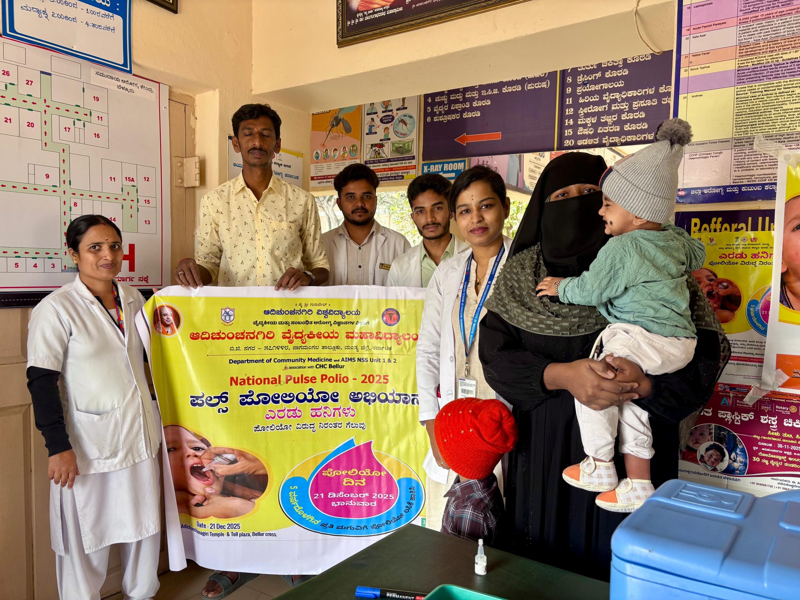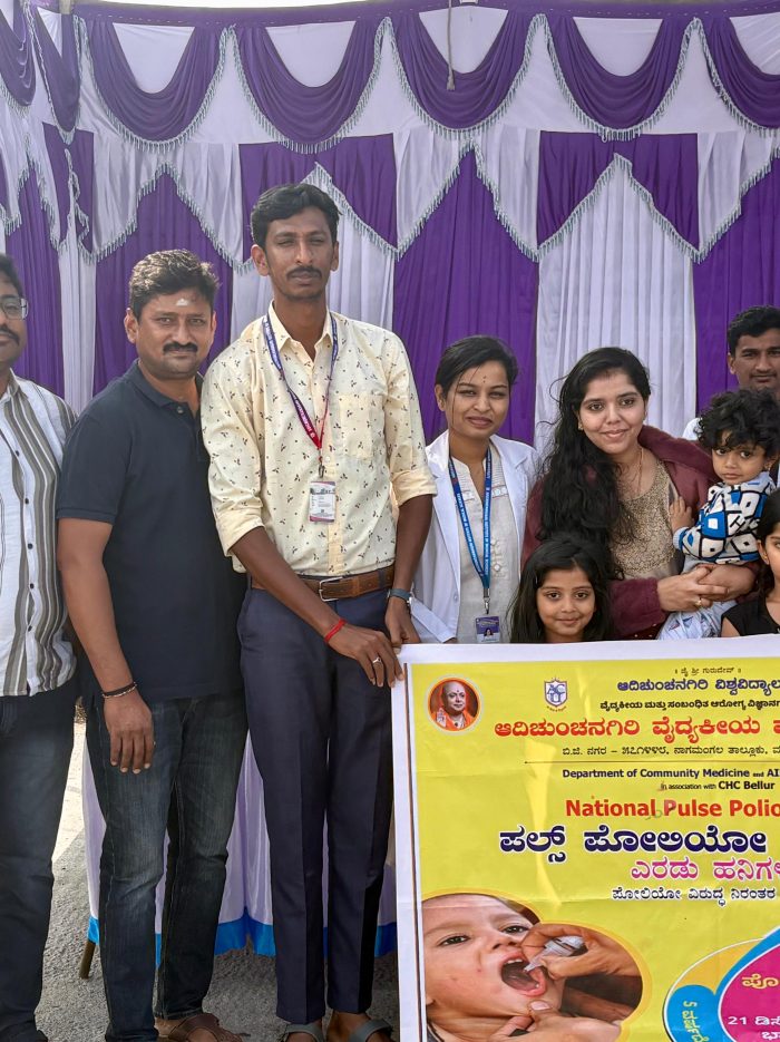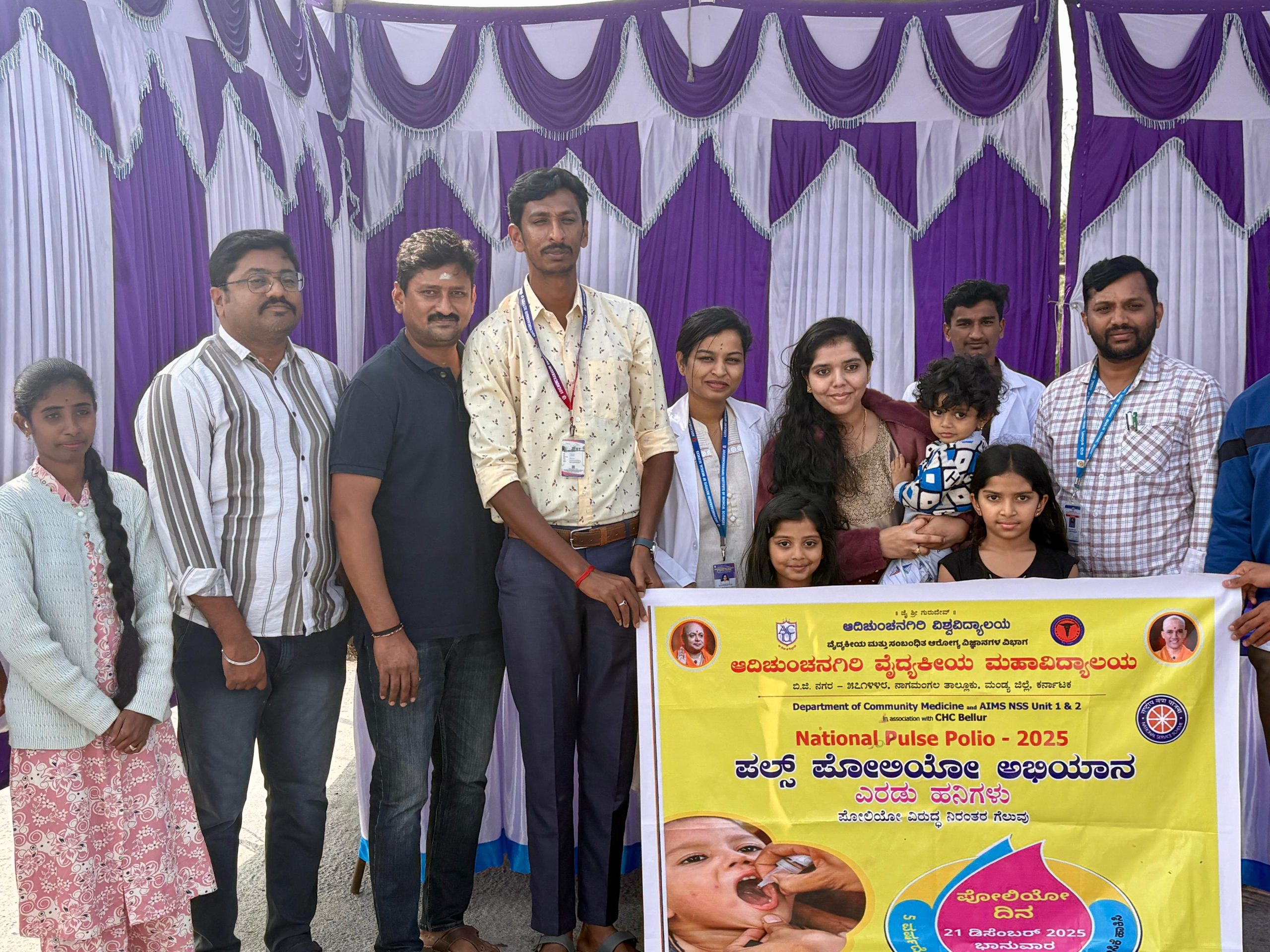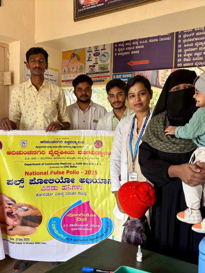 The National Pulse Polio Programme – 2025 was inaugurated at Adichunchanagiri Mutt by Poojya Mahaswamiji Sri Sri Sri Dr. Nirmalanandanatha mahaswamiji in the presence of Sri H. D. Kumaraswamy, Hon’ble Union Minister for Heavy Industries, Government of India. The programme was formally launched by administering polio drops to children, emphasizing the commitment to protect every child from poliomyelitis. The campaign was organized by the Department of Community Medicine and NSS Unit, AIMS, in association with CHC Bellur, under the guidance of Dr. Raghavendra S. K., Associate Professor and Head, Department of Community Medicine. Active participation of faculty members, health staff, NSS volunteers, interns, and students ensured effective community engagement and the successful conduct of the Programme. |