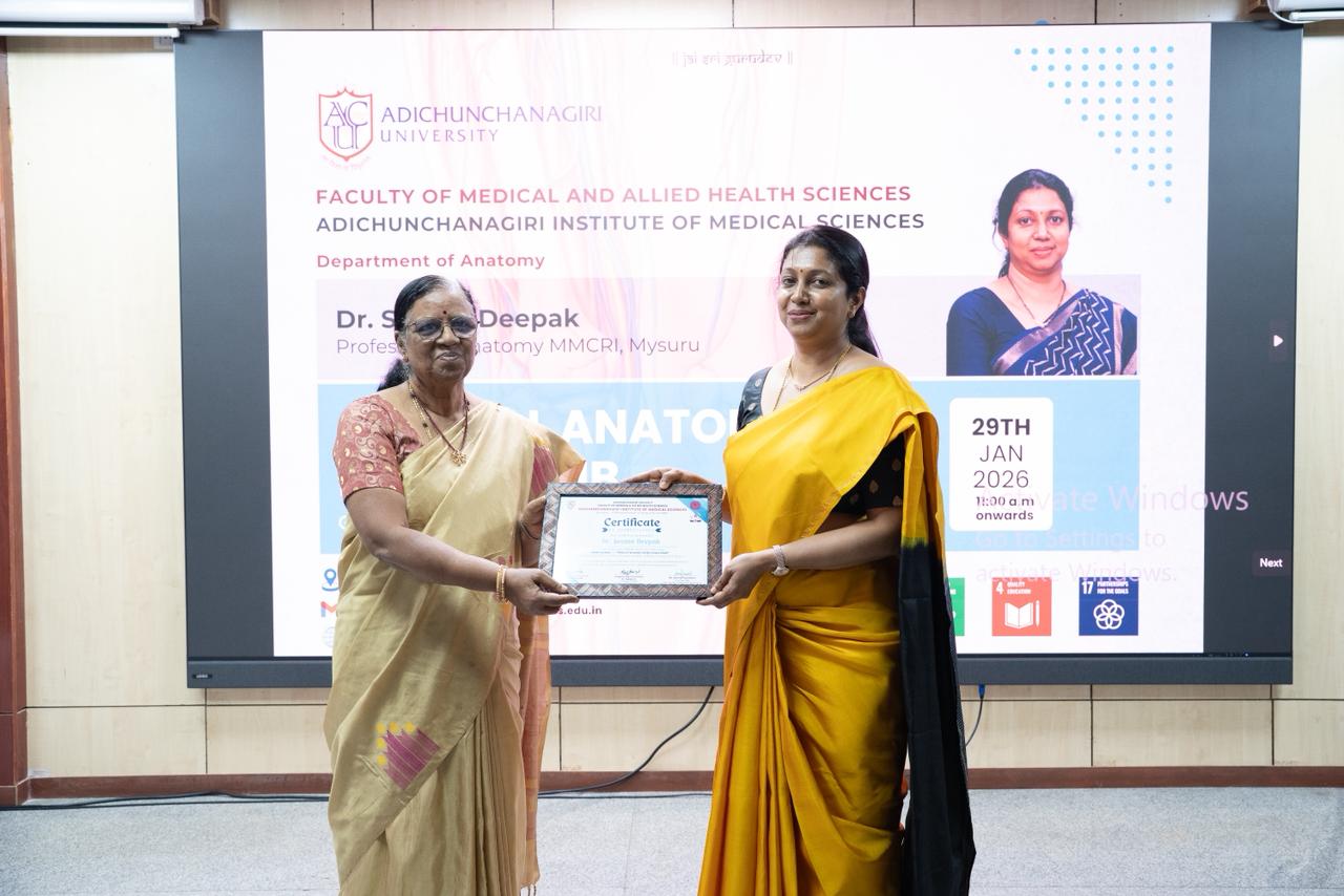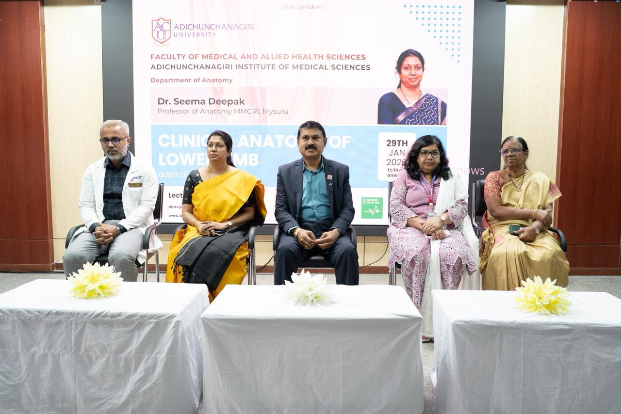 A Guest Lecture on “Clinical Anatomy of the Lower Limb”8 was successfully conducted by the Department of Anatomy, Adichunchanagiri Institute of Medical Sciences, under the Faculty of Medical and Allied Health Sciences, Adichunchanagiri University, on 29th January 2026 at 11:00 a.m. in Lecture Hall I, AIMS.