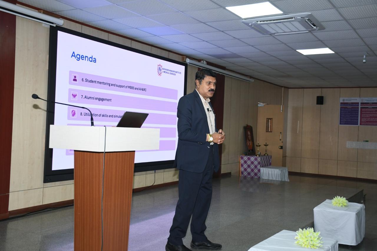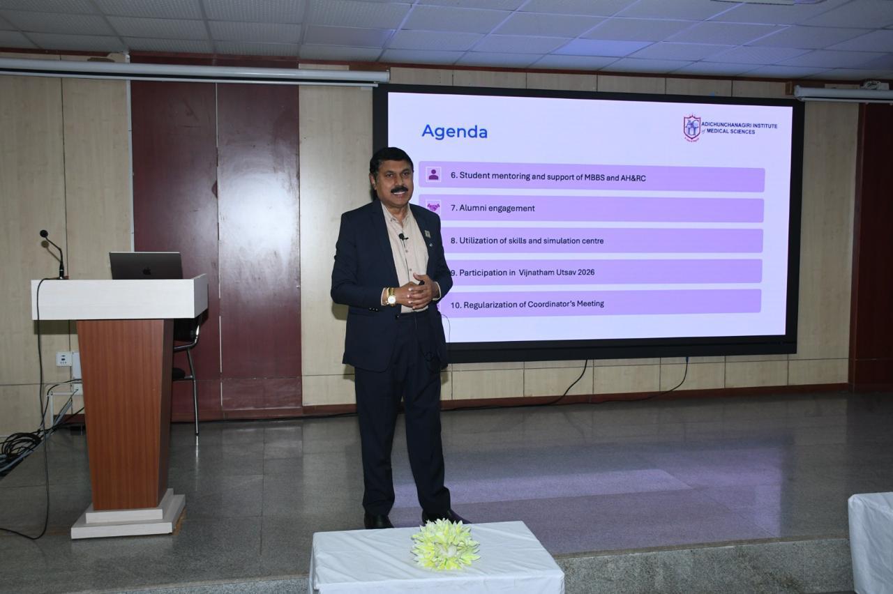 The importance of professional conduct, workplace ethics, student mentoring, alumni engagement, effective utilization of the Skill and Simulation Centre, and preparedness for AAA, NABH, and NABL accreditations was emphasized. Faculty and students were encouraged to actively participate in Vijnatham Utsav 2026 and ensure regular conduct of coordinators’ meetings.