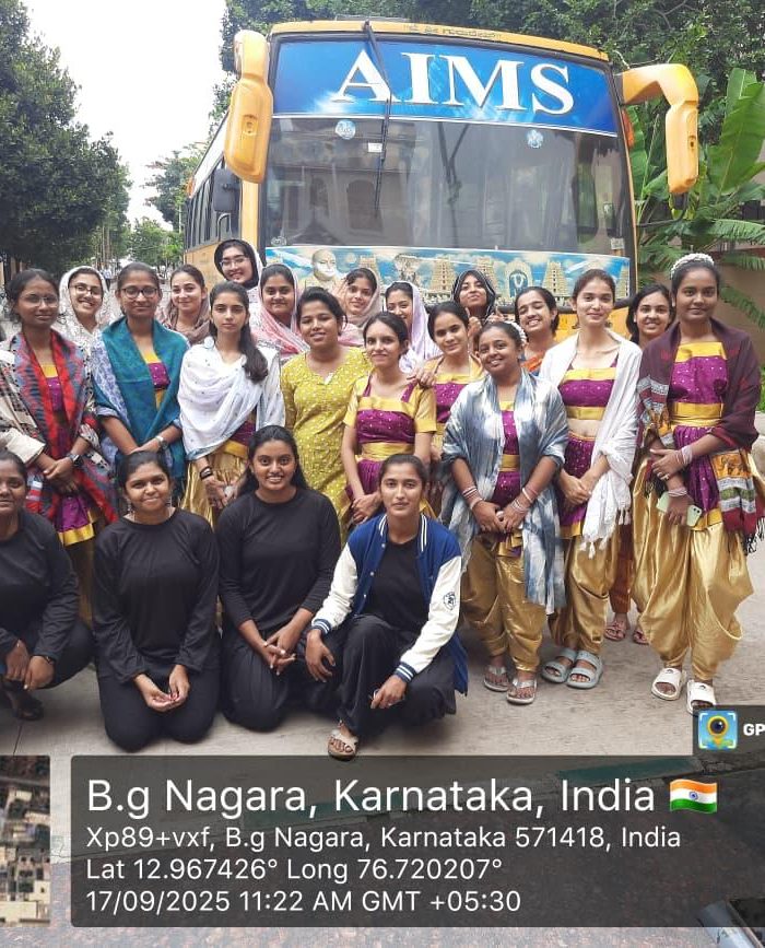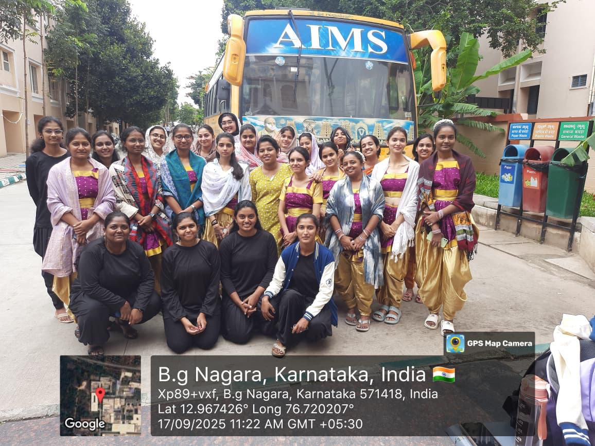 ‘Laasya’-The Bharatnatyam team of AIMS, along with students of Phase III MBBS, performed Navadurga semiclassical dance at the prestigious Yuva Sambhrama Festival in Mysore on 17th of September 2025. A mix of classical dancers, semiclassical dancers, and folk dancers presented a fusion of 3 songs. The organising committee felicitation our institution with a momento.